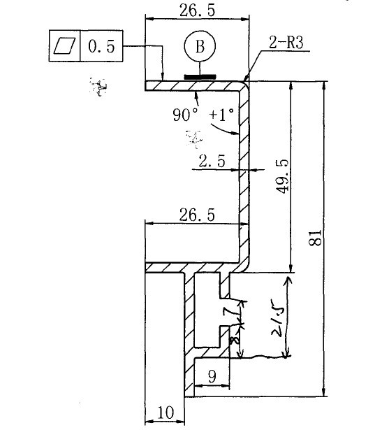 2.)半導(dǎo)軌折彎工件型材截面開口尺寸需滿足圖3所示,圖中所示的90°角不得小于90°,其余尺寸按圖紙要求進行控制。